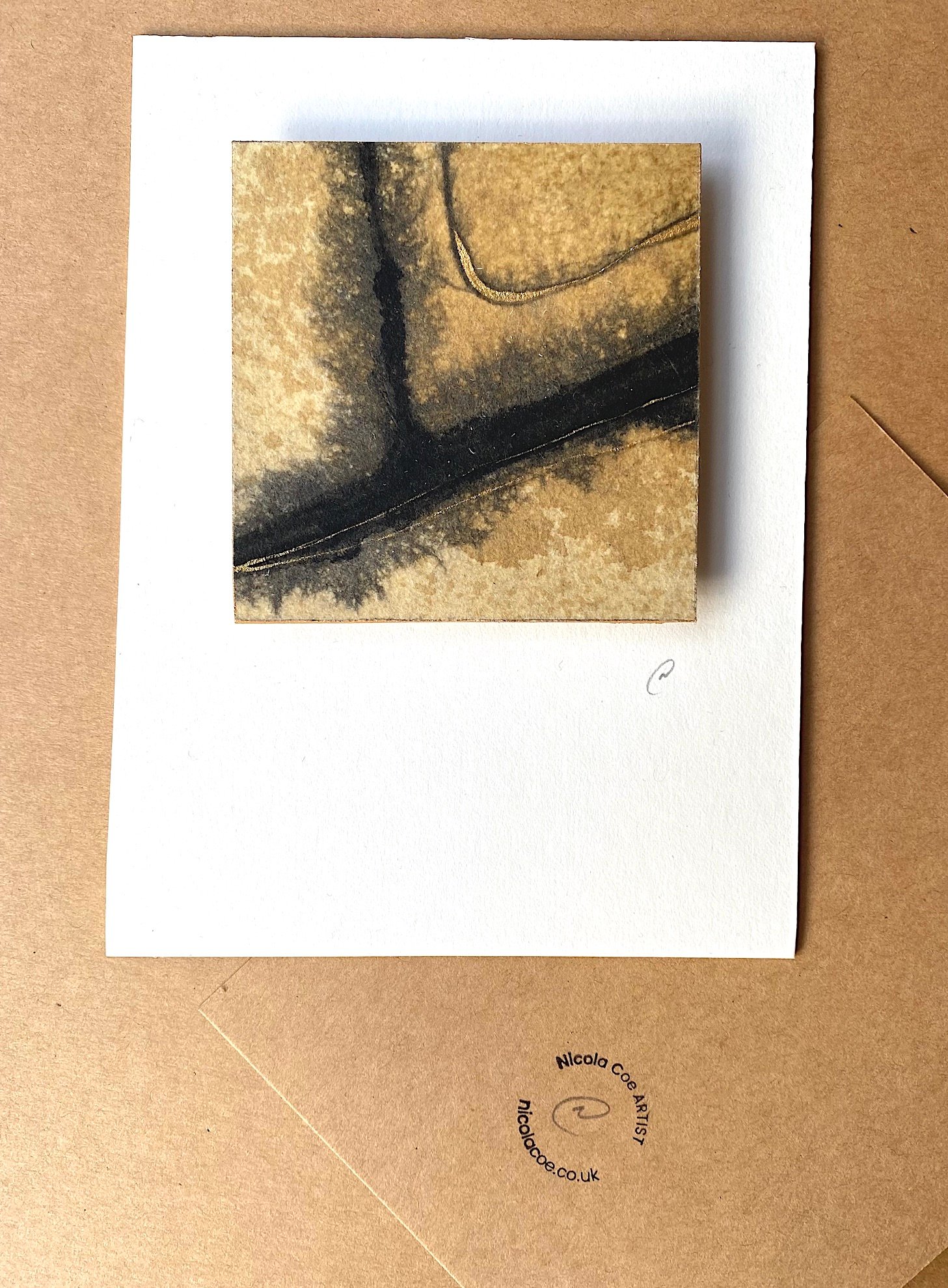 This artwork is 8cm square it is float mounted onto board which is and signed. Presented with a signed backing paper in a cellophane envelope.