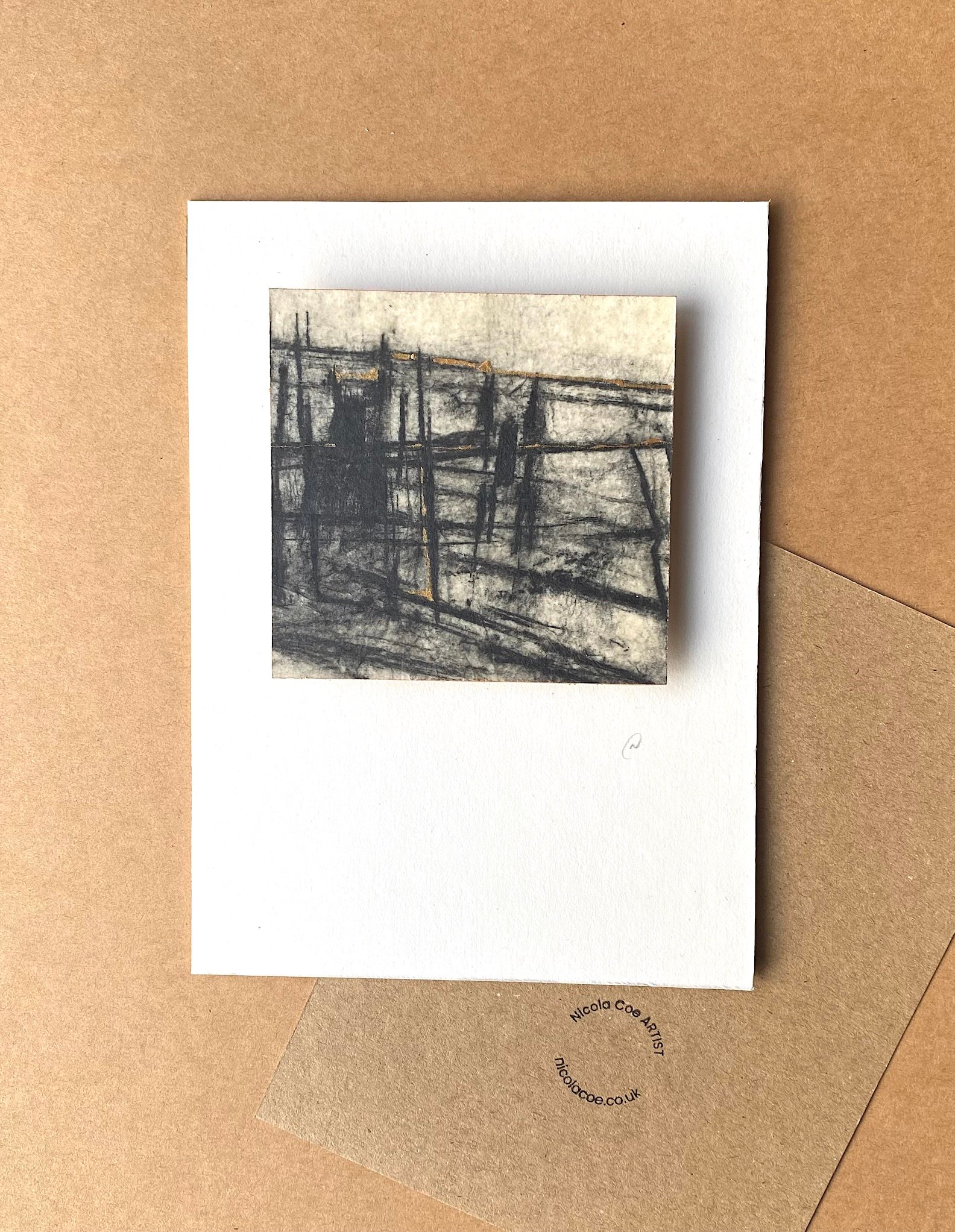 An original artwork created with a Graphite crayon onto Japanese Paper, portraying the structures of British farmland hedgerows as viewed in Winter. Details are picked out in gold ink and the whole image is then sealed with natural wax .